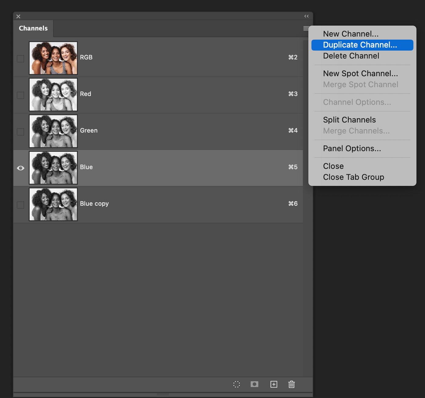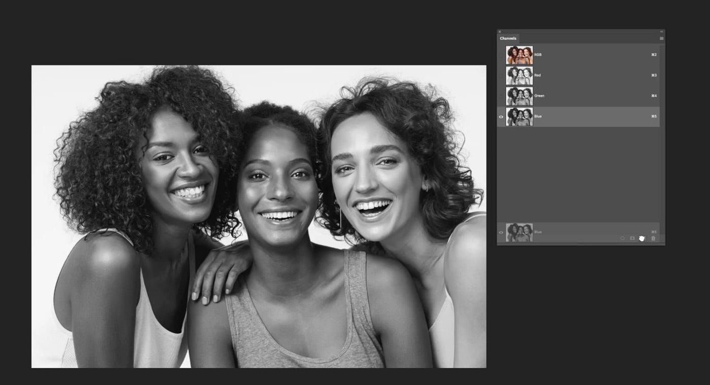 From here we can see the Blue Channel seems to show the best contrast between the models’ hair and the background. Let’s take a closer look at that Channel.