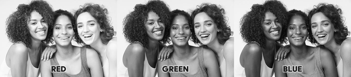 Here is where we’re gonna check out the R, G, and B Channels to see if one of these can help us make a Selection for the hair. Below you can see an image with the Red, Green, and Blue Channels side by side.