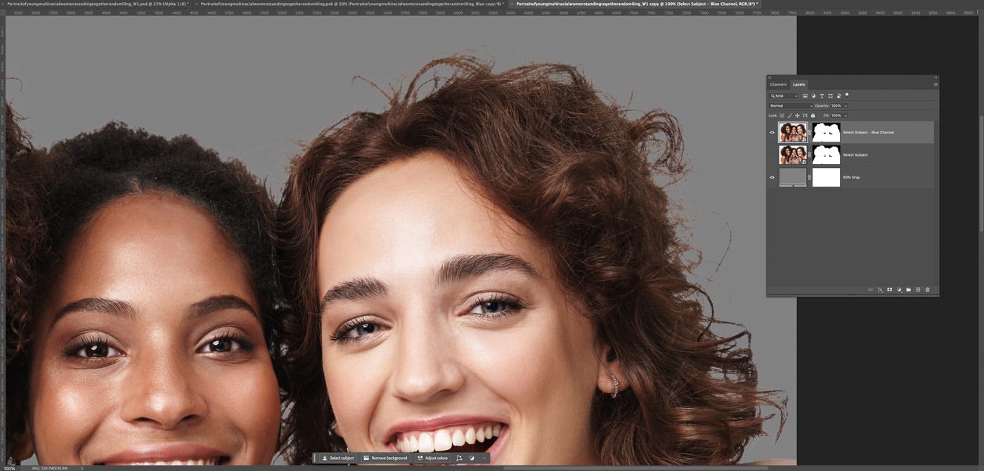 There are many ways to start creating a mask so we could replace the background but here we’re gonna simply see how well Select Subject works. Below you can see that did a pretty good job. There are some parts of the back and shoulder of the woman on the left that need addressing, but for now we’re focused on the hair.