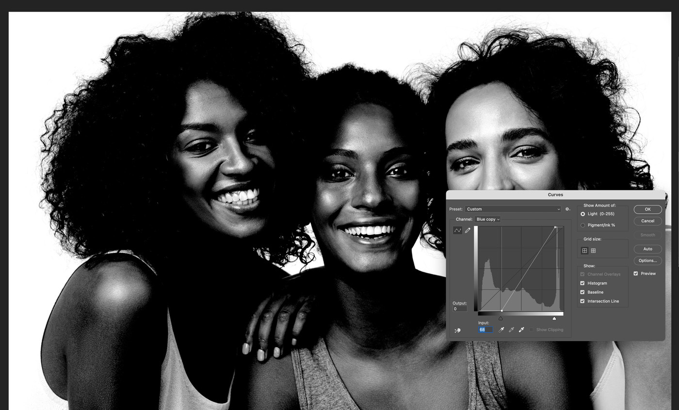 Now that we have a copy of the Blue Channel we’ll need to add some Contrast to make sure we can get a good selection to use with the mask we made with the Select Subject command. Click on the Blue Copy Channel in the Channels palette then bring up the Curves dialogue by tapping Command + M (Ctrl + M for Windows users). The Curves dialogue gives us a lot of control over just how we add the Contrast. In this case all we need to do is to bring the White Point over to the Left just a little. Then we bring the Black Point over to the right a little more, enough to be sure the hair edge is solidly Black as seen in the image below.