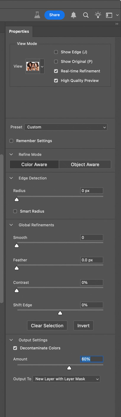 In the Select and Mask panel, shown on the right of our image, all we need to do is click on “Decontaminate Colors”. When we tell Photoshop to do this it spreads out the colors it sees near the edges of the masked layer so they will cover up any haloing or contamination from the background.